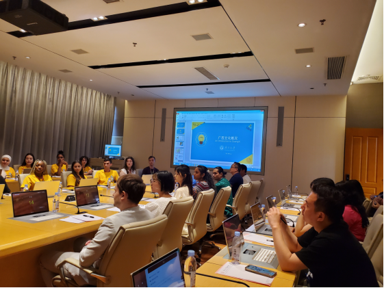 This cultural experience activity consists of three parts: Chinese culture lecture, Chinese and foreign youth symposium and campus tour.  First of all, Dr. Lu Wei from the International College gave the contestants a wonderful Chinese culture lecture, focusing on the history of Guangxi University, achievements of the university and Guangxi's minority cultures, major cities and important cultural and tourism elements. After the lecture, the winners used fluent Chinese to communicate and interact with the representatives of Chinese and foreign students of Guangxi University, and the atmosphere of the scene was active and bursts with laughter. After the exchange activities, the contestants took the sightseeing bus to visit the campus, along the way, the beautiful scenery of the campus, the superior teaching environment and the modern cultural and sports venues made everyone praise.