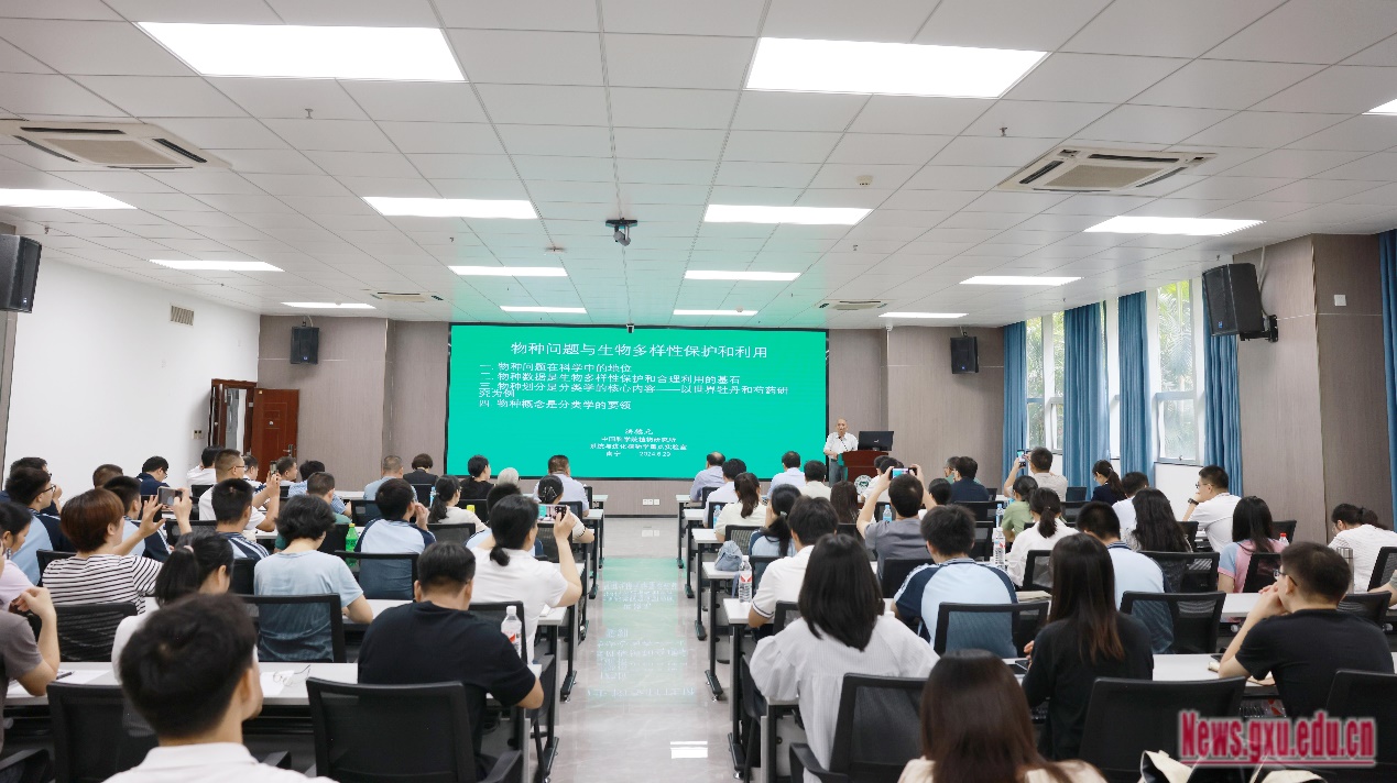 On June 29, Mr. Hong Deyuan, an academician of the Chinese Academy of Sciences, a fellow of the Third World Academy of Sciences, and a world-renowned botanist, was invited to deliver a lecture titled Species Issues and Biodiversity Conservation and Utilization at the Junwu Lecture Hall for the faculty and students of GXU. The event was hosted by Mr. Yu Wenjin, Vice President of GXU. Mr. Cai Zhongping, Director of the Forestry Bureau of the Autonomous Region, and Ms. Jiang Yinghong, a second-level inspector of the Forestry Bureau of the Autonomous Region, attended the lecture.