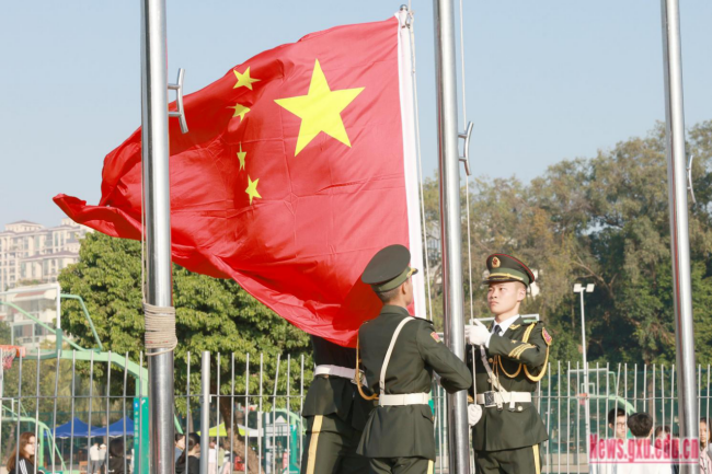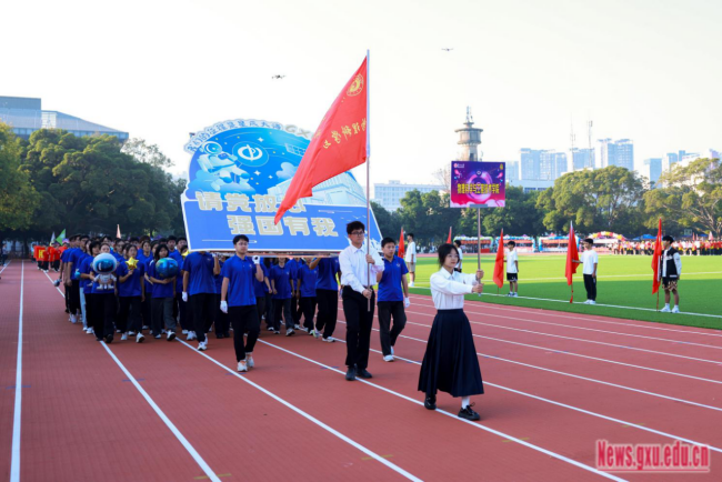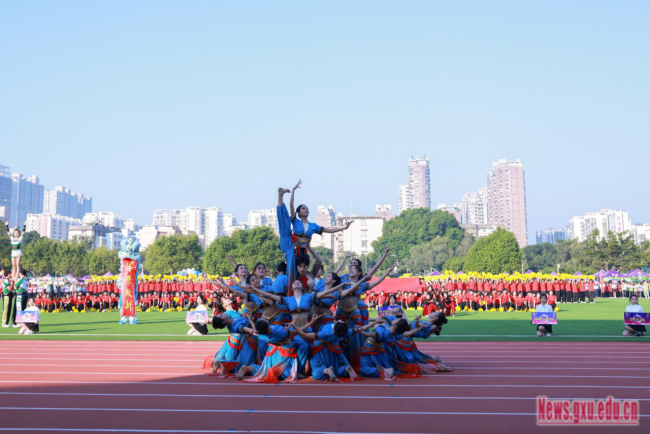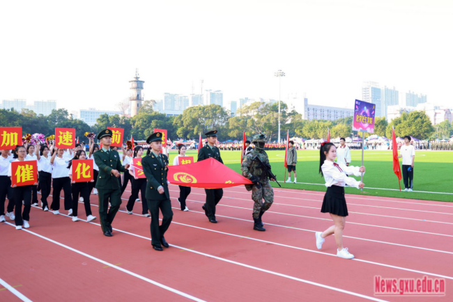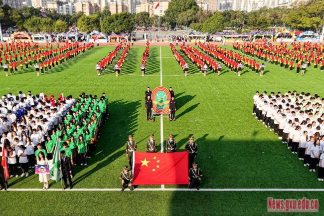 ເນື້ອເພງຂອງ 'ແຮງບັນດານໃຈ' ມີຄວາມກະຕືລືລົ້ນ ແລະດັງກ້ອງກັງວານໄປທົ່ວສະຖານທີ່, ເປີດສາກການປະຊຸມກິລາ. ທີມງານອອກກໍາລັງກາຍແຫ່ງຊາດທີ່ມີຊີວິດຊີວາໄດ້ປ່ຽນແປງຮູບແບບຢ່າງຕໍ່ເນື່ອງ, ຮູບແບບທີ່ແຕກຕ່າງກັນເຊັ່ນ pentagrams, "GXU", "96", ແລະອື່ນໆ, ເພື່ອສະແດງຄວາມຮັກຂອງຄູອາຈານແລະນັກຮຽນທີ່ມີຕໍ່ປະເທດຊາດແລະສະແດງໃຫ້ເຫັນເຖິງປະຫວັດສາດອັນຍາວນານຂອງ GXU ໃນໄລຍະ 96 ປີຜ່ານມາ. ເມື່ອເພງຊາດຖືກຮ້ອງຂຶ້ນ, ທັງຄູອາຈານແລະນັກຮຽນໄດ້ຮ້ອງເພງນີ້ດ້ວຍຄວາມຮັກແພງ. ທຸງແດງຫ້າດາວທີ່ສົດໃສໄດ້ລຸກຂຶ້ນຢ່າງຊ້າໆແລະກະພິບໃນສາຍລົມ.