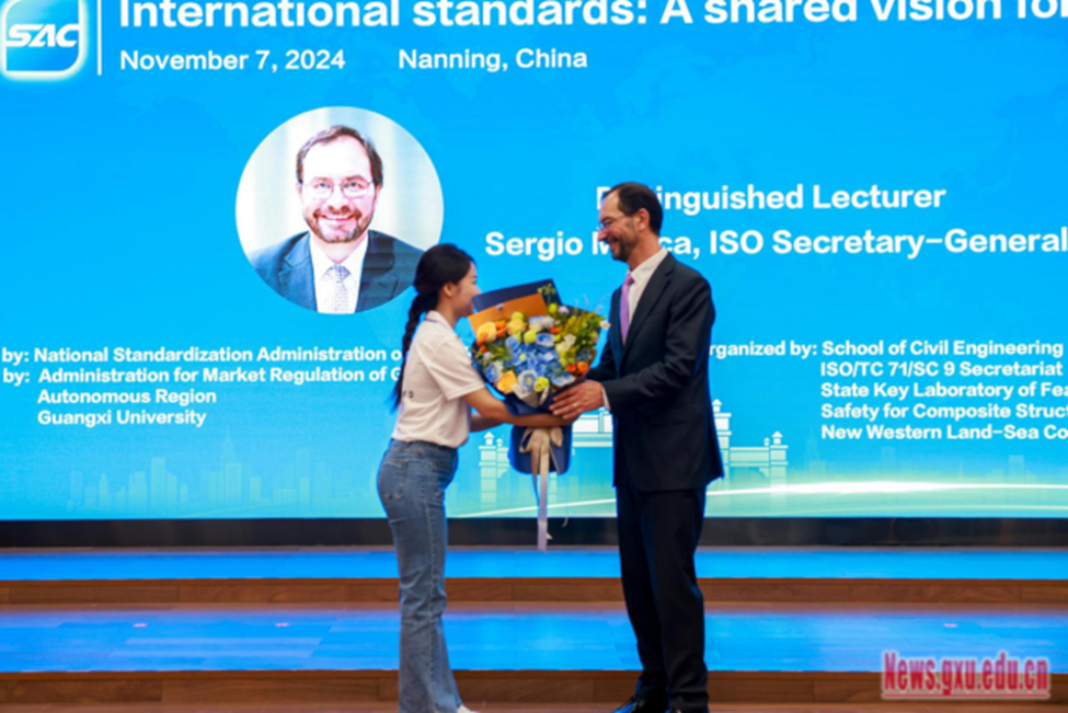កាលពីថ្ងៃទី 7 ខែវិច្ឆិកា អគ្គលេខាធិការនៃអង្គការស្តង់ដារអន្តរជាតិ (ISO) លោក Sergio Mujica បានទៅទស្សនាសាកលវិទ្យាល័យក្វាងស៊ីនិងចូលរួមព្រឹត្តិការណ៍ស្តង់ដារអន្តរជាតិក្រោមប្រធានបទ "ចែករំលែកចក្ខុវិស័យដើម្បីឲ្យពិភពលោកកាន់តែល្អប្រសើរ" ។ ក្នុងឱកាសនោះ លោកបានធ្វើការថ្លែងសុន្ទរកថាពីលេខាធិការដ្ឋាននៃអនុគណៈកម្មាធិការលើរចនាសម្ព័ន្ធដែក-បេតុង ក៏ដូចជារចនាសម្ព័ន្ធប្រភេទកូនកាត់ (ISO/TC 71/SC 9) ។ ព្រឹត្តិការណ៍នេះមានការចូលរួមពីសំណាក់វត្តមាននៃសមាជិកគណៈកម្មាធិការអចិន្ត្រៃយ៍នៃគណៈកម្មាធិការក្វាងស៊ី CPC ក៏ដូចជាអភិបាលរងនៃតំបន់ស្វយ័តក្វាងស៊ីជាំង លោកLu Xinning អគ្គនាយករងនៃនាយកដ្ឋានស្តង់ដារ និងការច្នៃប្រឌិតក្រោមការគ្រប់គ្រងរដ្ឋសម្រាប់បទប្បញ្ញត្តិទីផ្សារ  ក៏ដូចជាអ្នកតំណាងការិយាល័យគ្រប់គ្រងបច្ចេកទេស ISO ចិនលោក លោក Li Yubing អគ្គលេខាធិការរងរដ្ឋាភិបាលនៃតំបន់ស្វយ័តក្វាងស៊ីជាំង លោក Cui Jun លេខាធិការបក្ស និងជាអគ្គនាយកត្រួតពិនិត្យទីផ្សារនៃការិយាល័យតំបន់ស្វយ័តក្វាងស៊ីជាំង លោកLi Ze នឹងលេខាធិការនៃគណៈកម្មាធិការក្វាងស៊ី CPC លោក Li Guozhong ។ ព្រឹត្តិការណ៍នេះត្រូវបានដឹកនាំដោយប្រធានសាកលវិទ្យាល័យក្វាងស៊ី និងជាប្រធានអនុគណៈកម្មាធិការ ISO នៃរចនាសម្ព័ន្ធដែក-បេតុង លោក Han Linhai