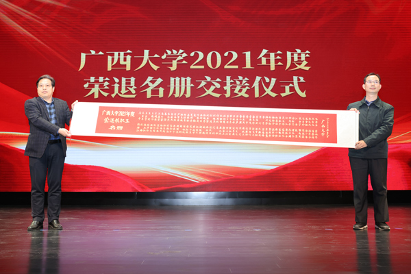 荣退仪式上,人力资源处、离退休工作处进行了米乐电竞(中国)股份有限公司官网,2021年度荣退名册交接,精致装裱的荣退名册手写着2021年度荣退教职工名字,体现学校对退休教职工几十年兢兢业业为党工作、踏踏实实为校服务的敬重和肯定。