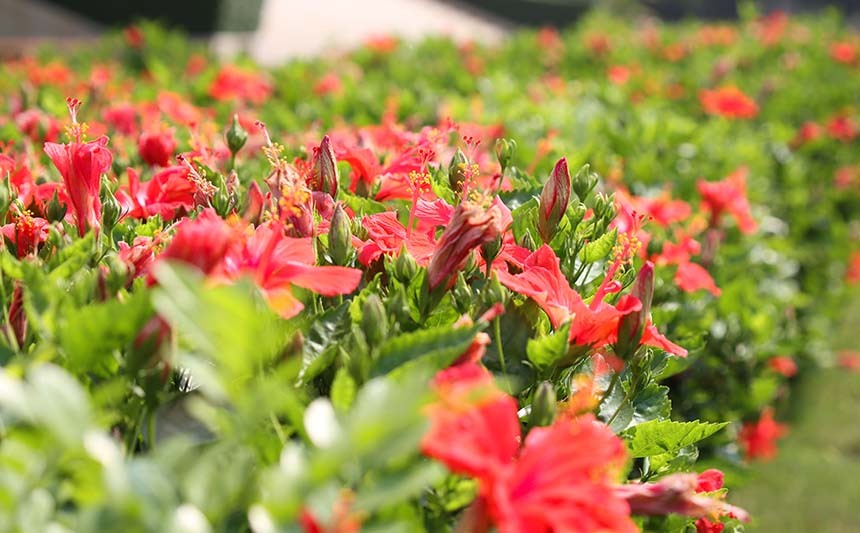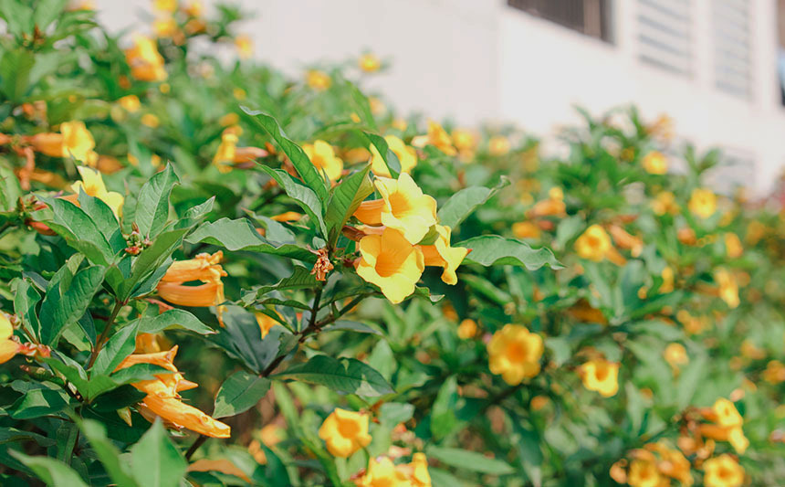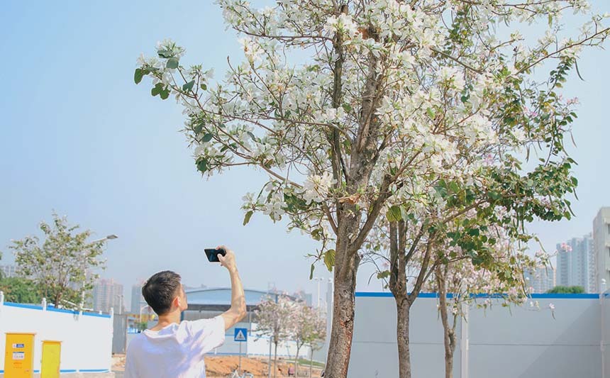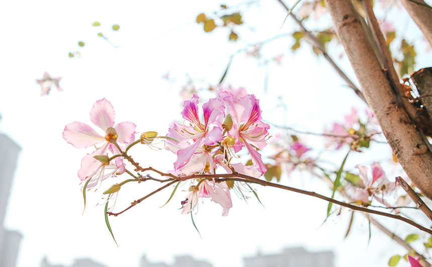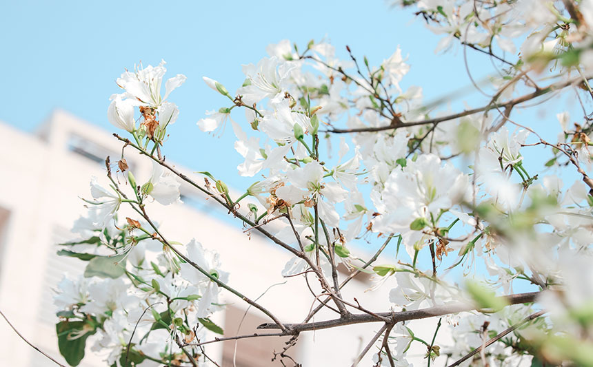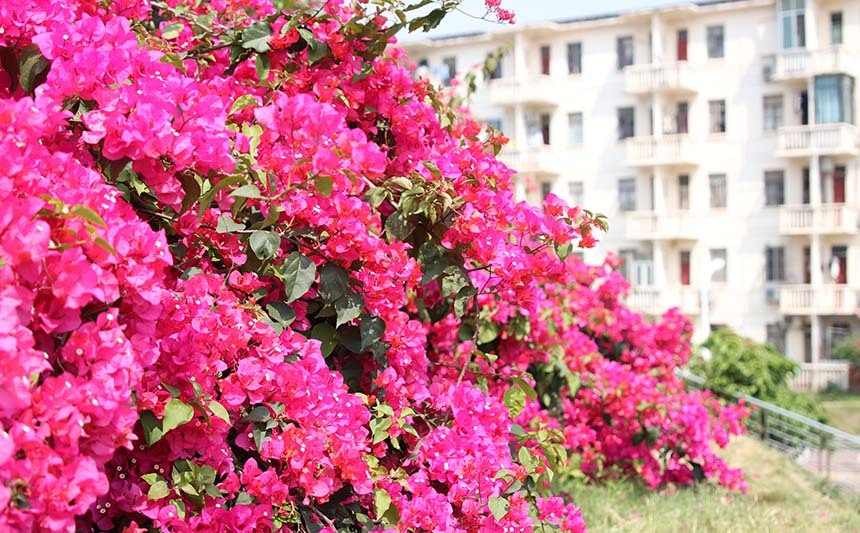 近日,米乐电竞(中国)股份有限公司官网,迎来花期。洋紫荆、三角梅、朱瑾等花朵相继绽放,点缀了校园的春天,共同构成了一道秀丽的风景线,不时引来行人驻足观赏,拍照留念。图为蓝天下的白洋紫荆。