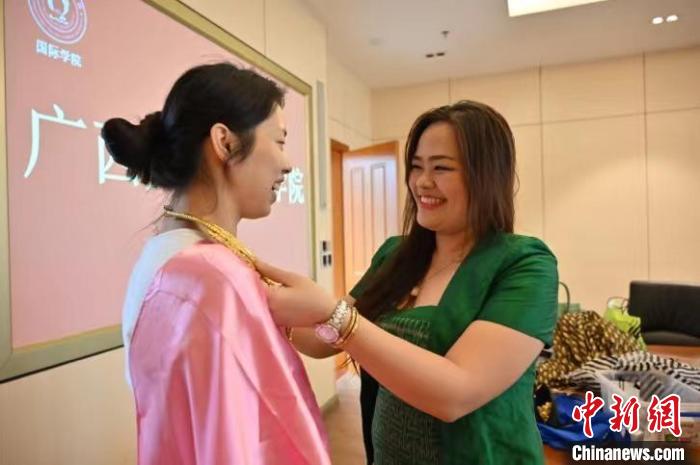 图为泰露露(右)为学生穿戴泰国传统服饰。 俞靖 摄