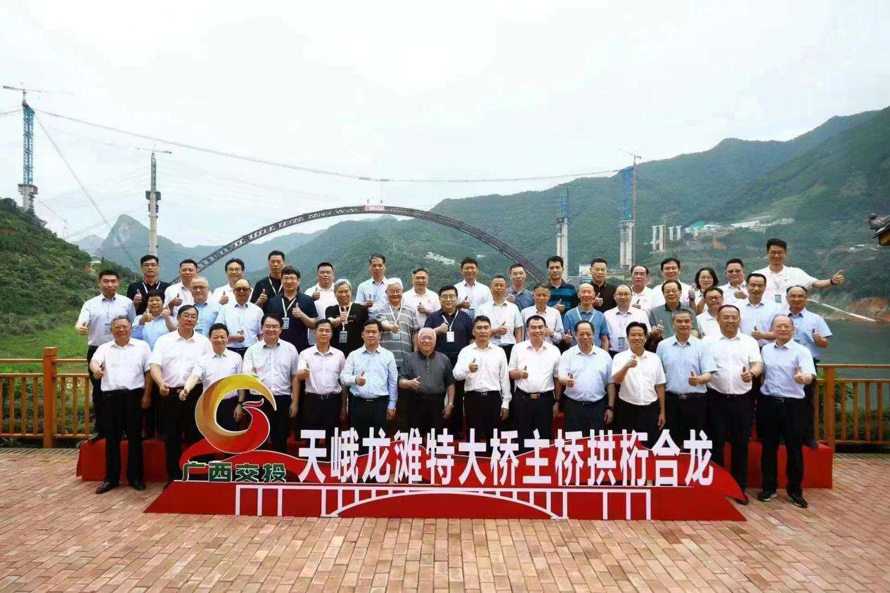广西壮族自治区政协副主席、米乐电竞(中国)股份有限公司官网,党委书记王乃学(前排左八),郑皆连院士(前排左七)与大桥建设团队在天峨龙滩特大桥施工现场(米乐电竞(中国)股份有限公司官网,供图)