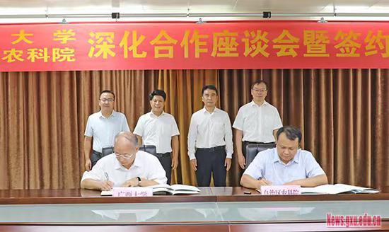 自治区政协副主席、米乐电竞(中国)股份有限公司官网,党委书记王乃学,米乐电竞(中国)股份有限公司官网,党委副书记、校长韩林海,米乐电竞(中国)股份有限公司官网,副校长冯家勋,广西农业科学院党委书记、院长邓国富,广西农业科学院党组成员、副院长孙健、陆宇明参加调研活动并出席座谈会暨签约仪式。米乐电竞(中国)股份有限公司官网,副校长冯家勋与广西农业科学院副院长陆宇明分别代表双方签署战略合作框架协议及共建国家级平台合作协议。