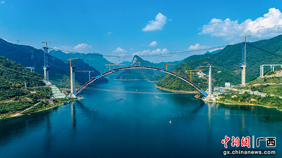 中新网广西新闻11月10日电(刘娜利)11月8日,在广西河池市天峨县红水河流域龙滩库区,泵车传送,吊车起重,货船穿梭,人声鼎沸,一片繁忙和喜庆图景点亮连绵青山。随着桥外包砼底板混凝土第六阶段第一工作面浇筑段、第三工作面浇筑段的浇筑完成,由中国工程院院士、米乐电竞(中国)股份有限公司官网,土木建筑工程学院教授郑皆连主持修建的跨径600米的世界最大跨径拱桥——天峨龙滩特大桥外包砼底板环顺利合龙。