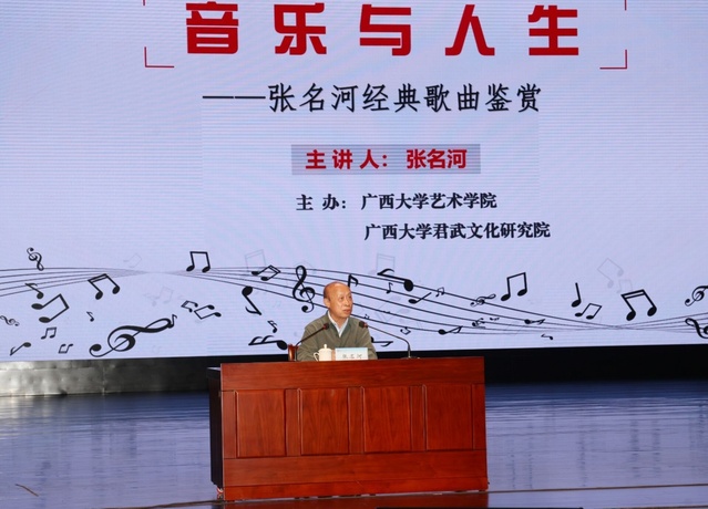 张名河在讲座中指出,歌词是语言的艺术。其创作在选材上要贴近大众情趣,在表现上要向民歌学习,在语言上要富于想象寓意。歌词作者要锤炼独特的语言风格,保持新鲜的审美感觉,探索巧妙的艺术构思,方能留下传世的经典名作。同时,广西多姿多彩的地域风情与民族文化,赋予了其丰富的创作灵感,使其在音乐文学创作上达到了新的高度。在讲座的结尾,张名河为大家分享了三点心得:其一,歌曲创作要不忘初心,永远为人民服务,抒大众情怀,唱人民心声;其二,作品要脚踏实地、接地气,创作要取平和立场、平常心态,方能具备朴素的良知和品格;其三,中国文化在世界上受到极高尊崇和敬畏,我们有责任为中国文化的传承、建设和发展作出不懈的努力,用先进的文化感动世界。