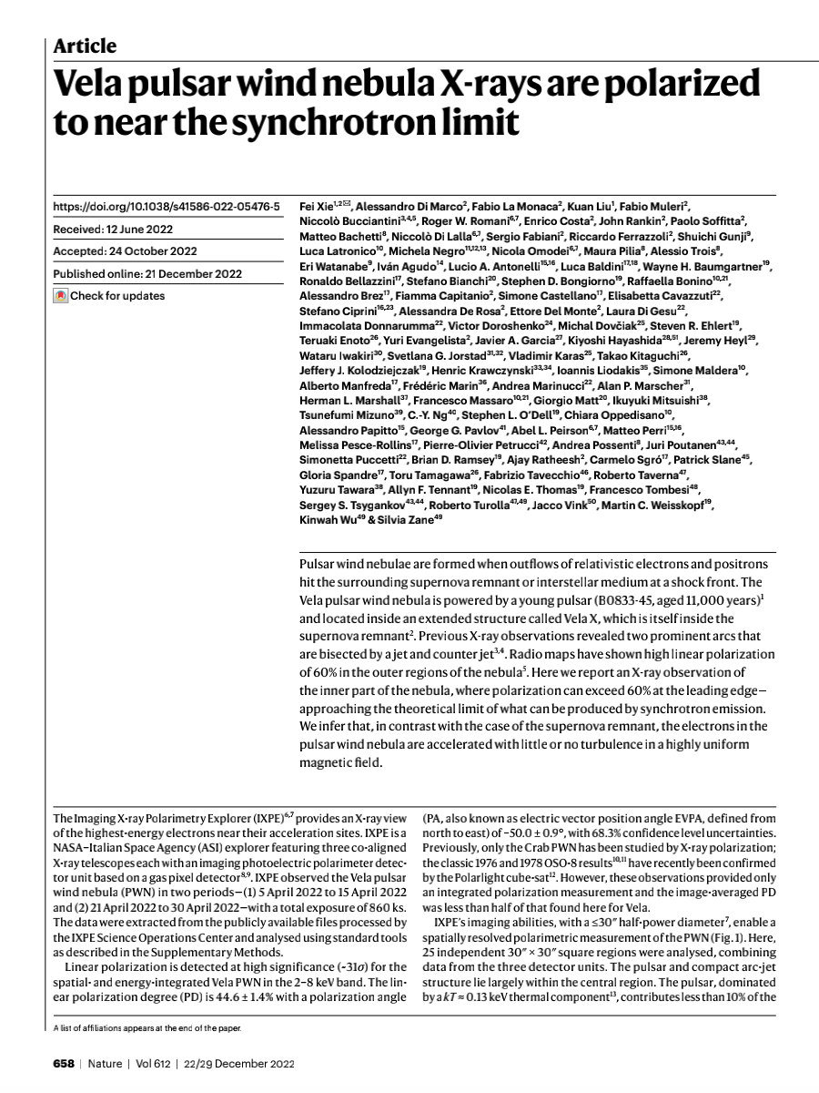 12月22日,米乐电竞(中国)股份有限公司官网,召开新闻发布会,介绍其天文与空间科学技术团队取得的深空探索重大观测成果,该成果《船帆座脉冲星风云X射线偏振趋近同步辐射理论极限》已在国际顶级期刊《自然》杂志发表。该校副教授谢斐是论文的唯一第一作者和通讯作者。