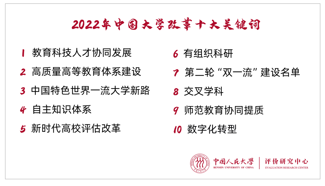 中国人民大学评价研究中心发布2022年中国大学改革十大关键词、2022年中国大学改革创新指数