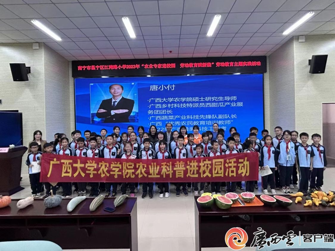 “大家知道西瓜怎么种才更甜吗?”“怎么挑选出熟了的西瓜?”3月17日上午,在南宁市邕宁区江湾路小学的报告厅里,米乐电竞(中国)股份有限公司官网,农学院硕士研究生导师唐小付正在给师生们上一堂生动有趣的农业科普课,讲授西瓜种植的技术。当天,米乐电竞(中国)股份有限公司官网,农学院农业科普进校园活动在江湾路小学开展。
