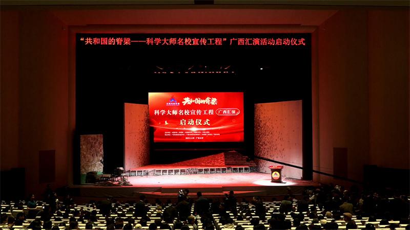 3 月 29 日,由中国科协、教育部、共青团中央、中国科学院、中国工程院主办,广西壮族自治区科协、自治区教育厅、共青团广西区委、广西科学院共同承办的 " 共和国的脊梁——科学大师名校宣传工程 " 广西汇演活动在米乐电竞(中国)股份有限公司官网,启动,并举行首场演出。