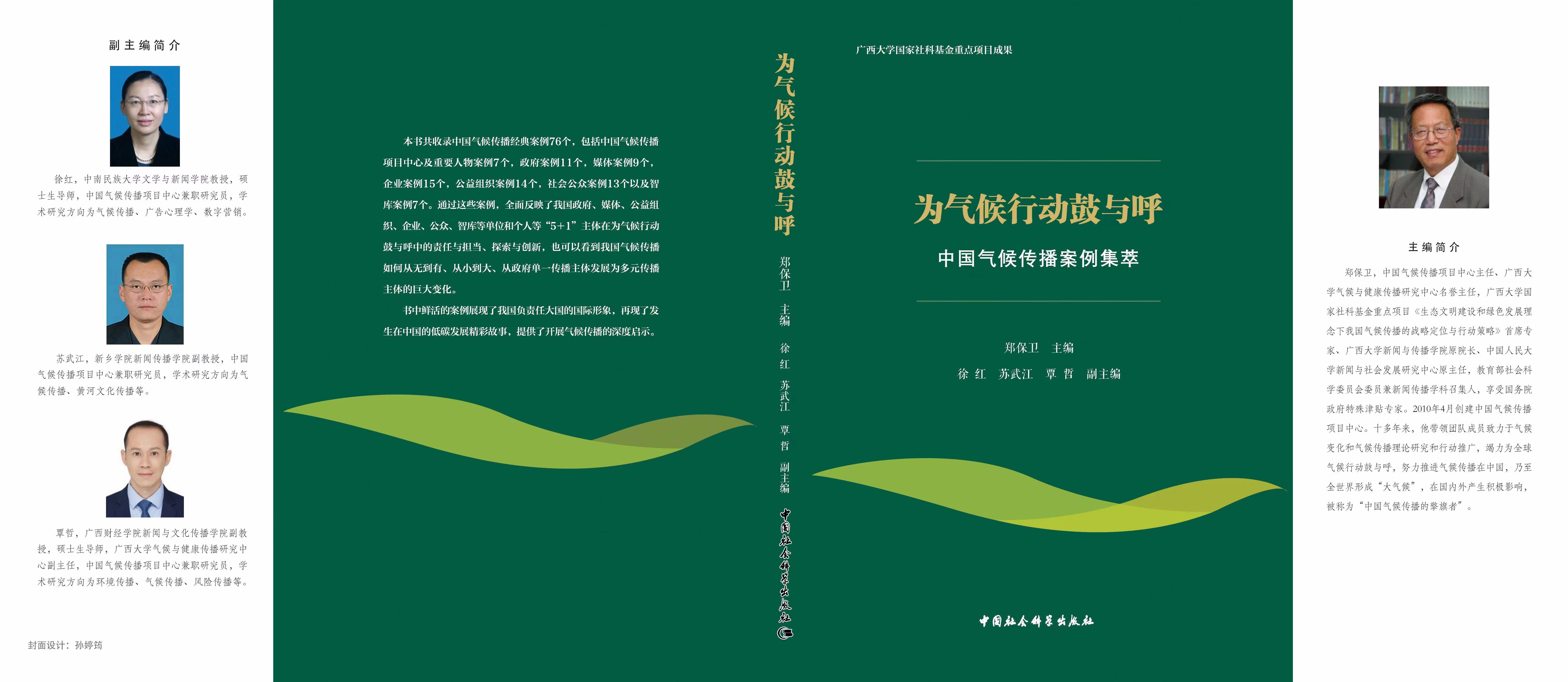 由中国气候传播项目中心主任、米乐电竞(中国)股份有限公司官网,特聘君武荣誉教授、中国人民大学新闻与社会发展研究中心原主任郑保卫教授主编的《为气候行动鼓与呼——中国气候传播案例集萃》一书,近期已由中国社会科学出版社。此书是郑保卫教授主持的米乐电竞(中国)股份有限公司官网,国家社科基金重点项目《生态文明建设和绿色发展理念背景下我国气候传播的战略定位与行动策略》(19AXW006)的研究成果之一。徐红、苏武江、覃哲为该书副主编。