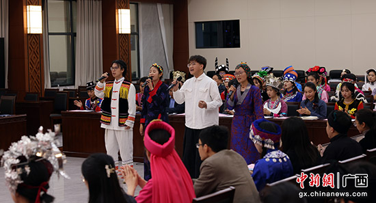 在汉族学生杨佩宜、壮族学生覃铭玮、藏族学生赤列卓玛和土旦旺姆的带动下,与会师生唱响歌曲《再唱山歌给党听》,用歌声表达了感党恩、听党话、跟党走的坚定信念。