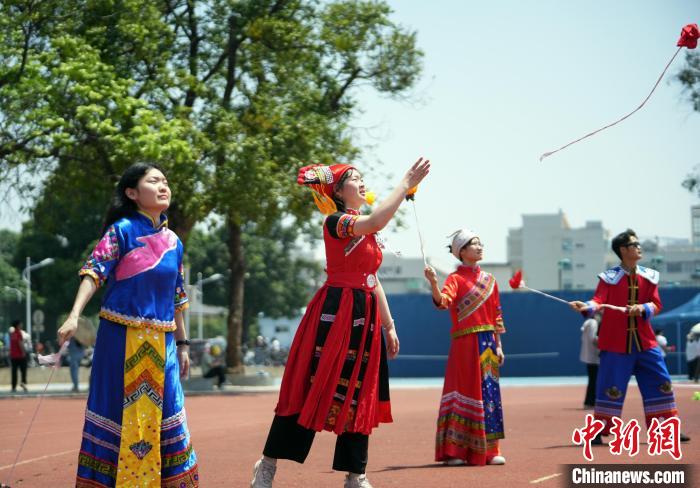 图为大学生在体验高杆抛绣球。 米乐电竞(中国)股份有限公司官网,供图