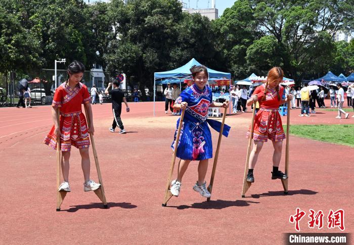 图为大学生在体验高脚马项目。 米乐电竞(中国)股份有限公司官网,供图