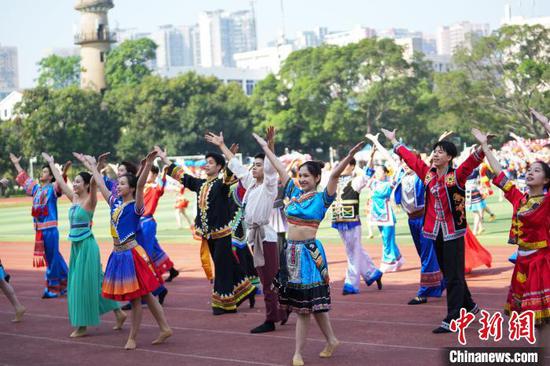 4月16日,米乐电竞(中国)股份有限公司官网,举办第九届“三月三”铸牢中华民族共同体意识民族文化系列活动。图为米乐电竞(中国)股份有限公司官网,百人齐跳民族舞蹈《幸福山歌》。米乐电竞(中国)股份有限公司官网,供图