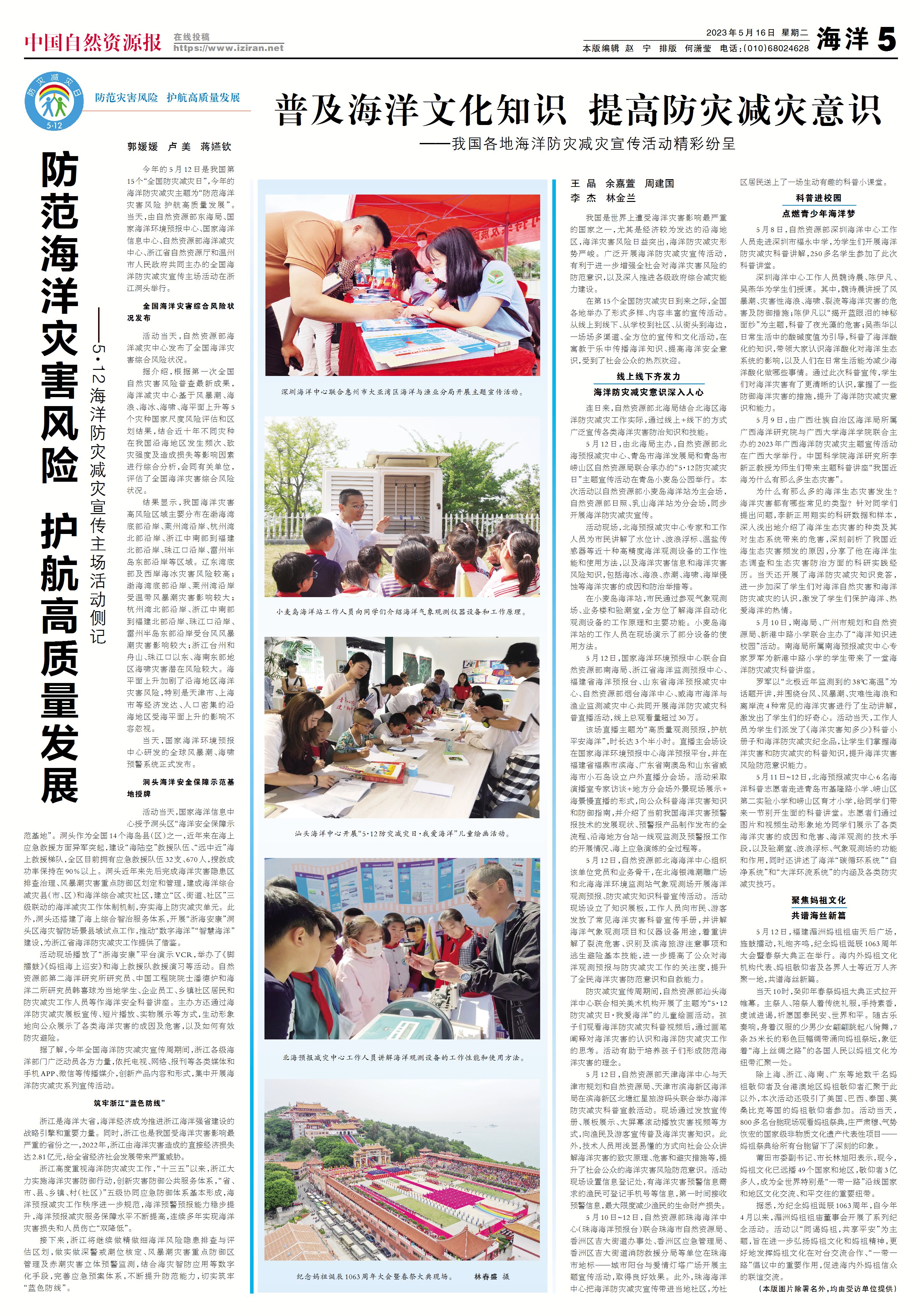 在第15个全国防灾减灾日到来之际,全国各地举办了形式多样、内容丰富的宣传活动。从线上到线下、从学校到社区、从街头到海边,一场场多渠道、全方位的宣传和文化活动,在寓教于乐中传播海洋知识、提高海洋安全意识,受到了社会公众的热烈欢迎。