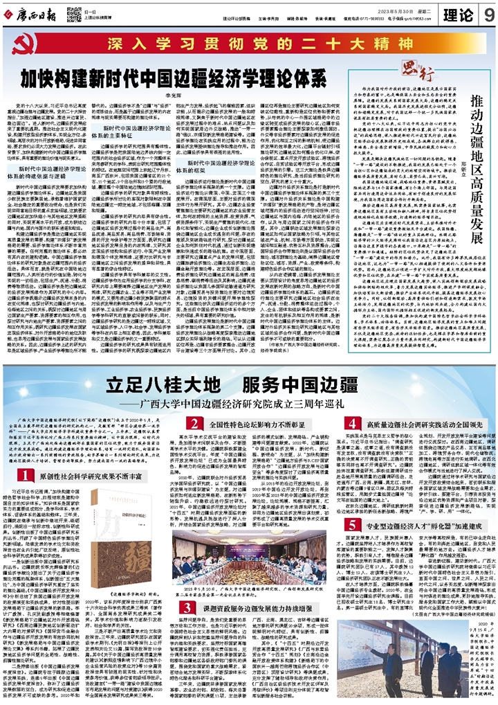 党的二十大报告强调,要加快构建中国特色哲学社会科学学科体系、学术体系、话语体系。当前,边疆地区经济发展的重点和难点问题有些涉及经济因素,有些涉及非经济因素。推动边疆地区高质量发展,不仅是边疆地区党委、政府的迫切任务,也是摆在学界和智库面前的重大课题,需要汇聚各方力量开展共同研究,构建新时代中国边疆经济学理论体系,为边疆高质量发展提供智慧支撑。