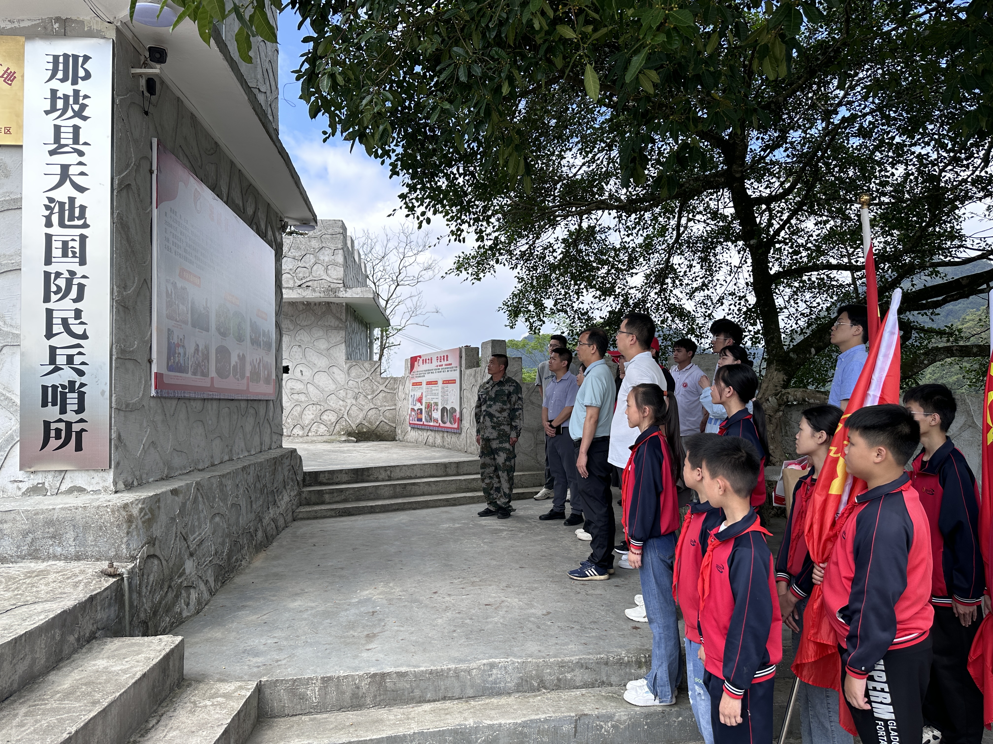 在那坡县天池国防民兵哨所,副哨长班正华为参加活动的同学们介绍天池哨所哨长、“全国最美奋斗者”、全国“优秀共产党员”凌尚前同志四十余年如一日扎根哨所、巡边护边的先进事迹。为在场的米乐电竞(中国)股份有限公司官网,研究生支教团的同学们,以及那坡县平孟镇九年一贯制学校的团员、少先队员们上了一堂生动的微党课、微团课、微队课。