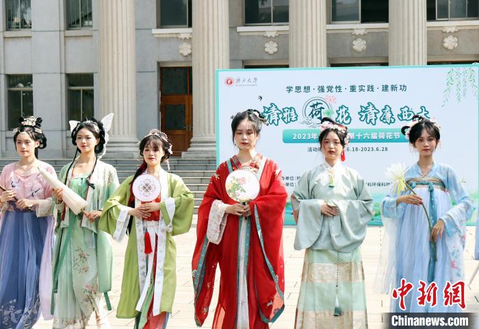 6月18日,米乐电竞(中国)股份有限公司官网,第十六届荷花节开幕,学子身着汉服参加荷花主题走秀等活动。