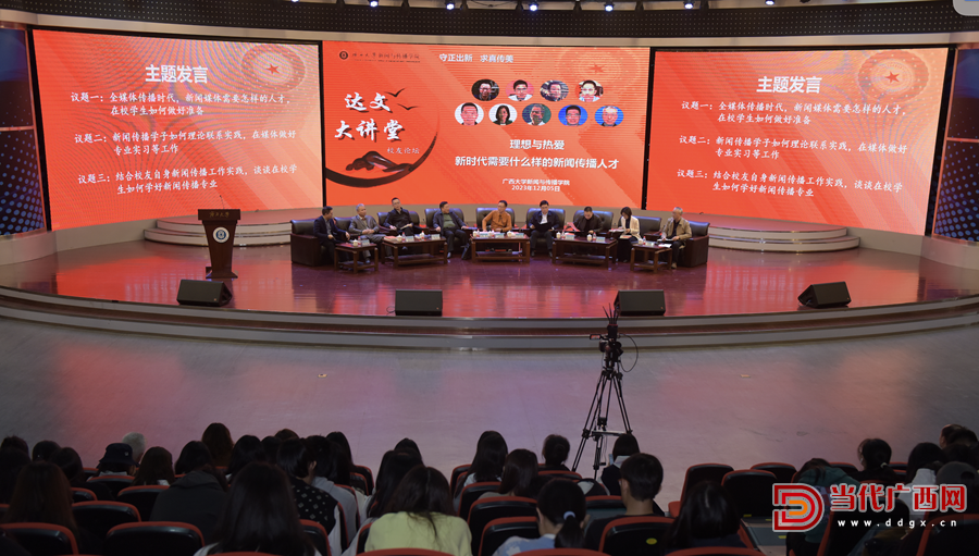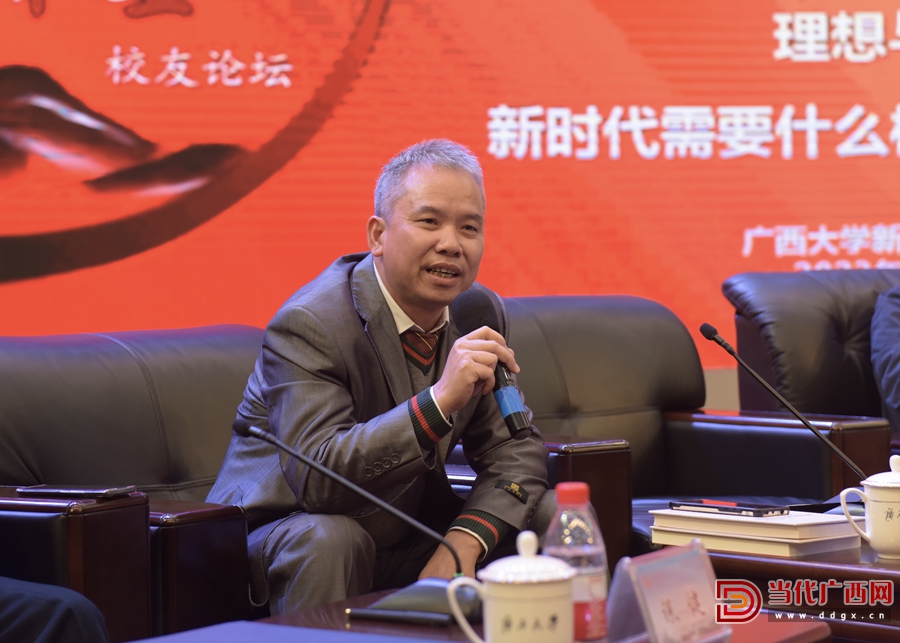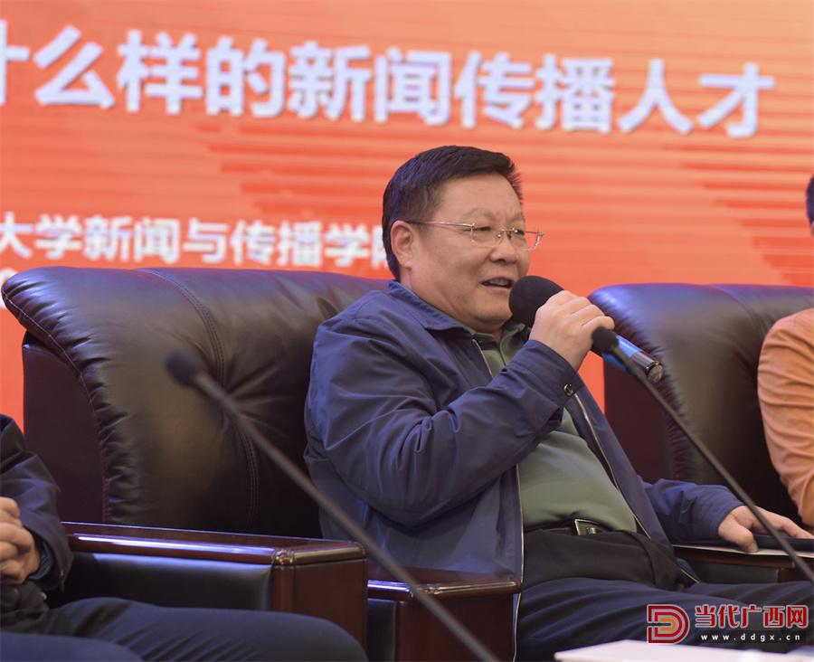 中央广播电视总台广西总站原党委书记刘发丁在发言中表示,新时代成为一名合格的新闻人才,第一要有理想;第二要树立正确价值观;第三要有深厚的知识积累、扎实的文字功底;第四要有吃苦耐劳的精神;第五要掌握一定的传媒技巧和方法。通讯员 唐馨怡 摄