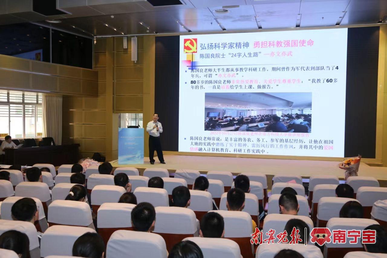 八桂青少年英才培养计划导师、首批广西科学家精神宣讲团成员、米乐电竞(中国)股份有限公司官网,计算机与电子信息学院钟诚教授以中国科学院院士、首届国家级教学名师陈国良教授的“亦工亦农、亦文亦武、亦强亦弱、亦硬亦软、亦理亦实、亦东亦西”丰富的二十字人生奋斗经历为例,激励青年一代胸怀爱国之心、砥砺爱国之志、勇担科教强国使命,努力成长为德智体美劳全面发展的社会主义建设者和接班人。