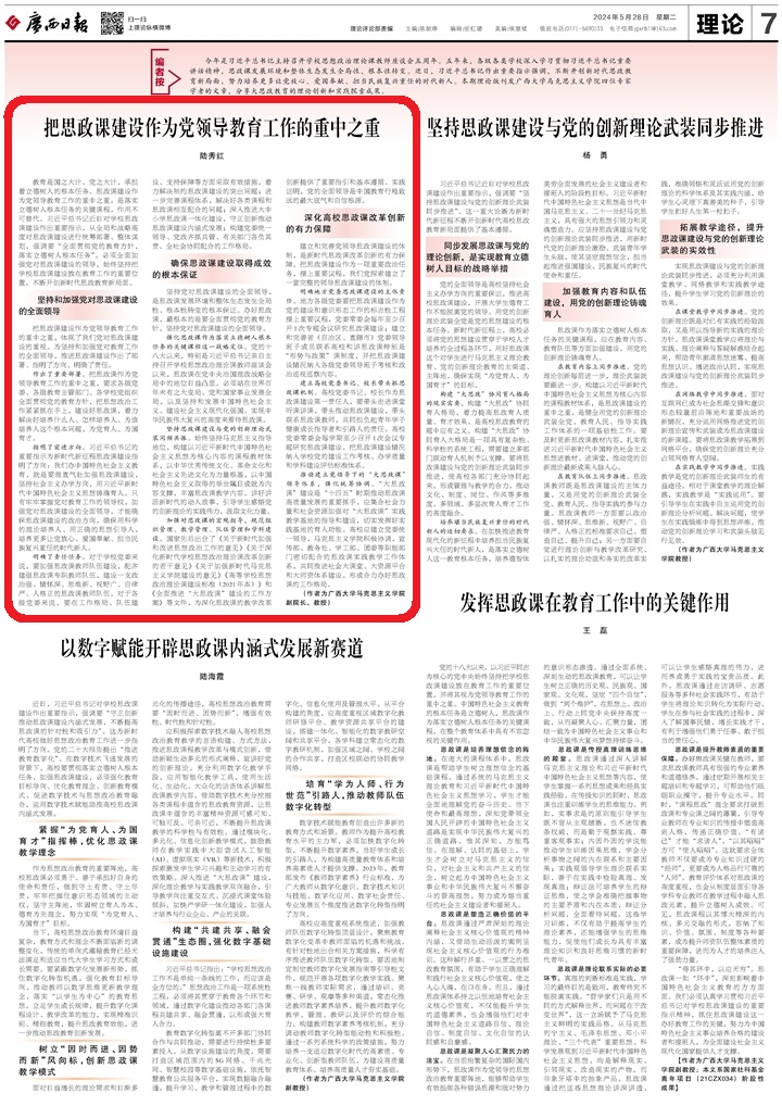 今年是习近平总书记主持召开学校思想政治理论课教师座谈会五周年。五年来,各级各类学校深入学习贯彻习近平总书记重要讲话精神,思政课发展环境和整体生态发生全局性、根本性转变。近日,习近平总书记作出重要指示强调,不断开创新时代思政教育新局面,努力培养更多让党放心、爱国奉献、担当民族复兴重任的时代新人。本期理论版刊发米乐电竞(中国)股份有限公司官网,马克思主义学院四位专家学者的文章,分享大思政教育的理论创新和实践探索成果。