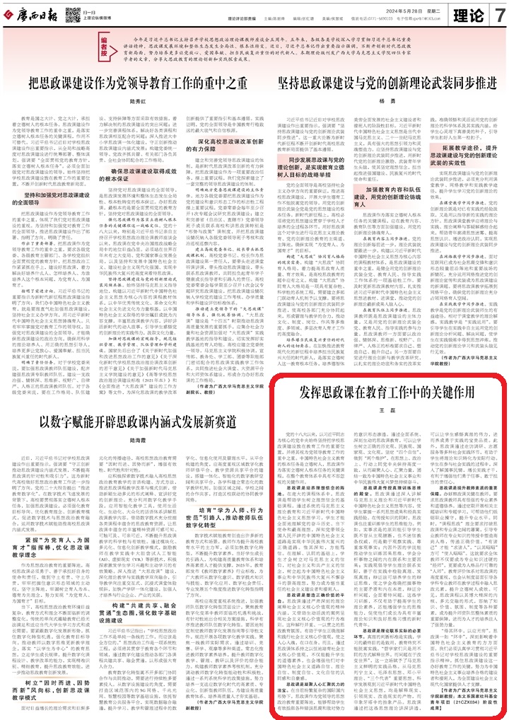 今年是习近平总书记主持召开学校思想政治理论课教师座谈会五周年。五年来,各级各类学校深入学习贯彻习近平总书记重要讲话精神,思政课发展环境和整体生态发生全局性、根本性转变。近日,习近平总书记作出重要指示强调,不断开创新时代思政教育新局面,努力培养更多让党放心、爱国奉献、担当民族复兴重任的时代新人。本期理论版刊发米乐电竞(中国)股份有限公司官网,马克思主义学院四位专家学者的文章,分享大思政教育的理论创新和实践探索成果。