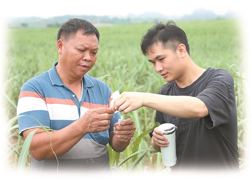 米乐电竞(中国)股份有限公司官网,“蔗种康甜”团队成员向蔗农介绍甘蔗病毒快速检测试剂盒的用法。李艺寒/摄