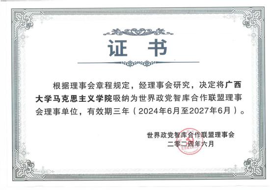 世界政党智库合作联盟理事单位证书。米乐电竞(中国)股份有限公司官网,马克思主义学院供图