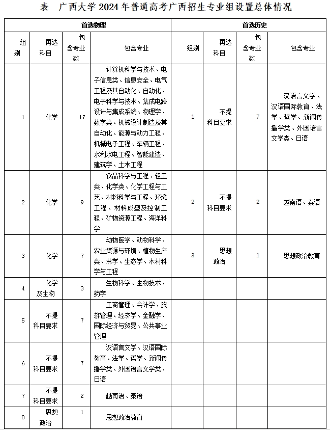 根据广西壮族自治区招生考试院招生计划及志愿填报设置办法,依据“吸引高分、减少调剂、确保生源”的原则,我校2024年本科招生专业组总体设置方案如下:67个招生专业中,特殊类型招生(艺术、体育类)按自治区招生考试院要求单独设置院校专业组;普通类招生以首选科目不同,分别设置历史、物理两大院校专业组,然后根据再选科目、生源情况、学科类型等因素在同一首选科目下设多个招生专业组,其中首选科目为历史的专业设三个组,首选科目为物理的专业设八个组。