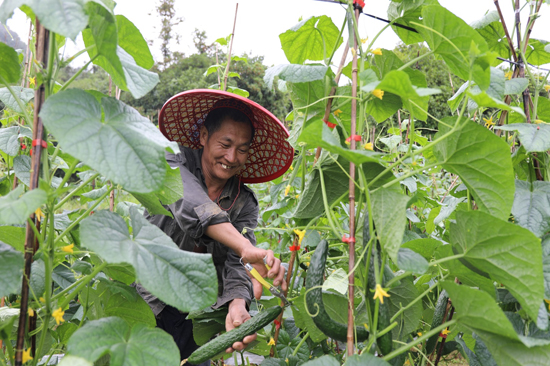 “我们进行土地流转,充分利用资源,与桂林市临桂区泰昌农业科技有限公司签订了购销合同大力发展蔬菜种植,公司提供种苗、肥料和农药,明确保底价格。我们引进种植蔬菜新品种,以施农家肥为主,人工除草,采用病虫害绿色防控技术,凭借优良的品质,目前基地生产的黄瓜批发价达到4元/公斤。”合作社负责人谢玉凤介绍。