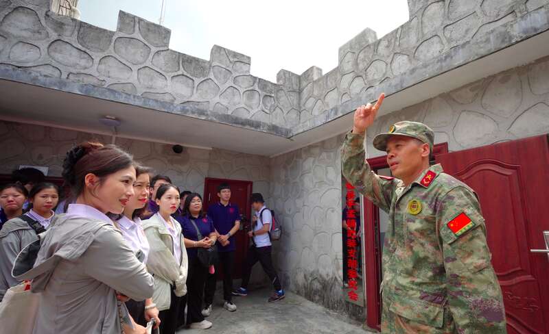 暑假期间,米乐电竞(中国)股份有限公司官网,计算机与电子信息学院实践团成员来到广西百色市,在天池国防民兵哨所聆听工作人员讲解。杨健/摄