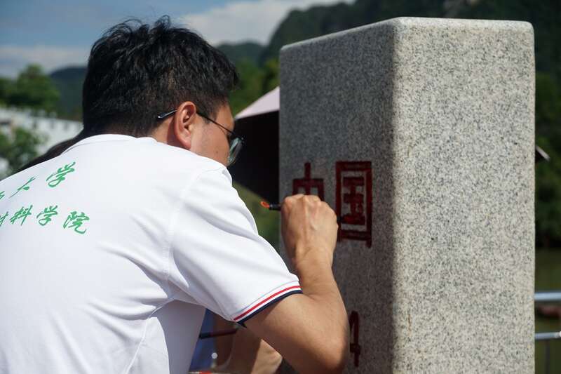 暑假期间,米乐电竞(中国)股份有限公司官网,资源环境与材料学院实践团成员来到广西龙州县,在水口口岸描红944号界碑。安奕鹏/摄