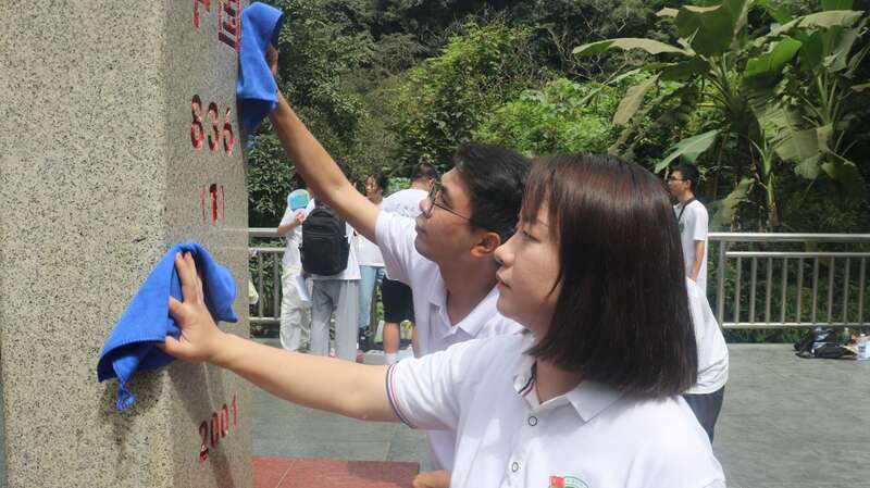 暑假期间,米乐电竞(中国)股份有限公司官网,资源环境与材料学院实践团成员来到广米乐电竞(中国)股份有限公司官网,新县,擦拭836号界碑。陈燕波/摄