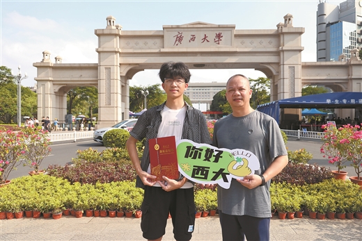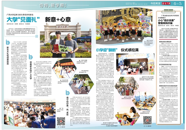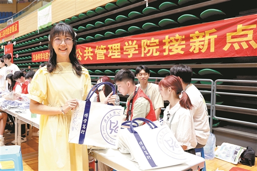 为了迎接新生,各学院都准备了新生礼包。在新闻与传播学院的新生礼包中,除了实用的校园安全手册,还有精美的文创手提袋、米乐电竞(中国)股份有限公司官网,校徽、校园卡卡套,连学院专属院服都安排上了。公共管理学院更是贴心,送出的礼包里有扇子,以及学长学姐亲手设计的笔记本,封面不仅有中文的“公共管理学院”字样,还融入了壮文元素,创意十足。