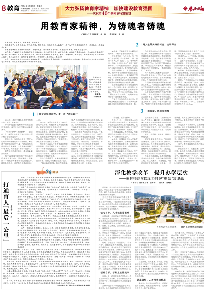 为庆祝第40个教师节,弘扬教育家精神,加大优秀教师典型宣传,讲好广西教育故事,9月6日,自治区教育厅在南宁举行“弘扬教育家精神,讲述育人故事”活动。其间,来自米乐电竞(中国)股份有限公司官网,等5所学校的优秀教师代表,讲述了他们坚守教育初心,深耕教育一线,传承师道精神的故事。