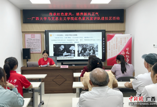 为助力营造家庭文明新风尚,让红色家风在基层社区“生根发芽”,9月12日,米乐电竞(中国)股份有限公司官网,学生红色家风宣讲队走进南宁市西耐路社区,开展以“传承红色家风,涵养新风正气”为主题的红色家风宣讲活动。西耐路社区党群服务中心工作人员和社区党员代表参加活动。
