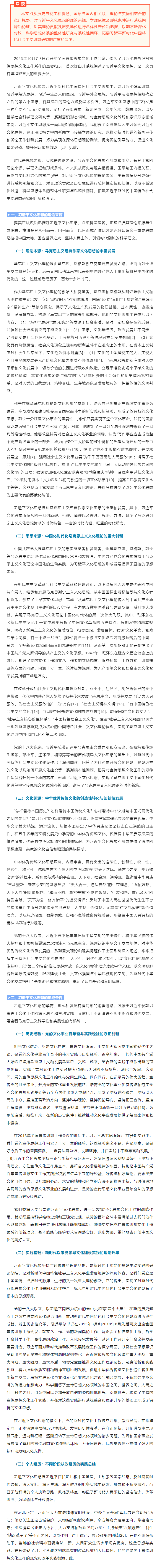 2023年6月2日,文化传承发展座谈会明确文化建设方面的“十四个强调”,即:(1)强调坚持和加强党对宣传思想文化工作的全面领导,担负起新的文化使命,建设社会主义文化强国,铸就社会主义文化新辉煌;(2)强调坚持马克思主义在意识形态领域指导地位的根本制度,推进马克思主义中国化时代化,建设具有强大凝聚力和引领力的社会主义意识形态;(3)强调坚持文化自信,推动社会主义文化繁荣兴盛,建设中华民族现代文明;(4)强调以社会主义核心价值观引领文化建设,广泛开展中国特色社会主义和中国梦宣传教育,使全体人民在理想信念、价值理念、道德观念上紧紧团结在一起;(5)强调加快构建中国特色哲学社会科学,以我国实际为研究起点,阐释中国道路、解读中国实践、构建中国理论;(6)强调推动中华优秀传统文化创造性转化、创新性发展,让中华文化展现出永久魅力和时代风采;(7)强调提高新闻舆论传播力引导力影响力公信力,弘扬主旋律、传播正能量,巩固壮大奋进新时代的主流思想舆论;(8)强调坚持以人民为中心的创作导向,把社会效益放在首位,推出更多增强人民精神力量的优秀作品;(9)强调要像爱惜自己的生命一样保护历史文化遗产,加强文物保护利用和文化遗产保护传承,守护好中华文脉;(10)强调中国式现代化是物质文明和精神文明相协调的现代化,能促进全体人民精神生活共同富裕,促进人的全面发展;(11)强调铸牢中华民族共同体意识,建设中华民族共有精神家园;(12)强调过不了互联网这一关就过不了长期执政这一关,要把互联网这个变量变成事业发展的增量,培育积极健康向上向善的网络文化,建设网络文明;(13)强调提升国家文化软实力和中华文化影响力,加强国际传播能力建设,讲好中国故事,推动中华文化更好走向世界;(14)强调弘扬全人类共同价值,落实全球文明倡议,推动文明交流互鉴,丰富世界文明百花园,等等。