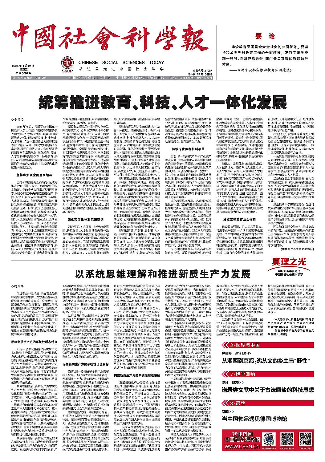 2024年9月,习近平总书记在全国教育大会上指出:“要统筹实施科教兴国战略、人才强国战略、创新驱动发展战略,一体推进教育发展、科技创新、人才培养。”这一重要论述为统筹推进教育、科技、人才一体化发展提供了根本遵循、指明了前进方向。我们要坚持问题导向和系统观念,深化教育、科技、人才体制机制综合改革,畅通教育、科技、人才良性循环,形成推动高质量发展的倍增效应,为推进中国式现代化持续注入强劲动力。