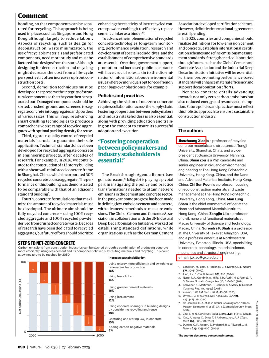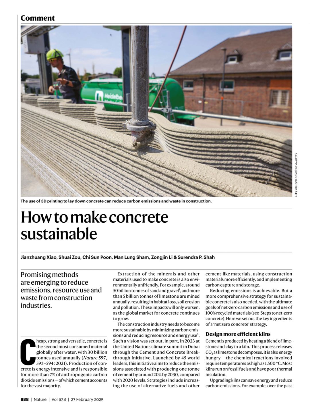 近日,米乐电竞(中国)股份有限公司官网,党委常委、副校长,米乐电竞(中国)股份有限公司官网,双碳科学与技术研究院院长,同济大学长聘教授肖建庄携手来自不同国家和机构的顶尖学者,以米乐电竞(中国)股份有限公司官网,作为通讯单位,在国际顶级学术期刊《Nature》发表评论性文章 “How to make concrete sustainable”,为建筑关键材料的绿色可持续发展提供了清晰的科学依据和技术路线图,引发广泛关注。