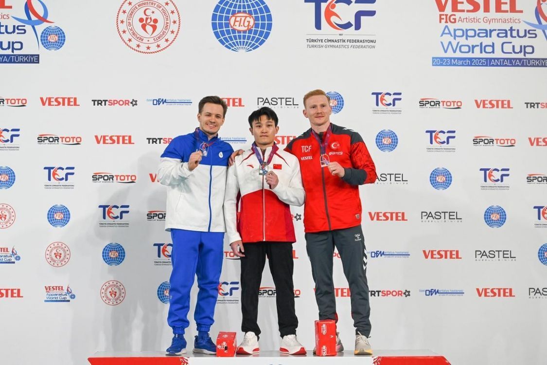 3月22日,冠军中国选手兰星宇(中)与亚军阿塞拜疆选手西蒙诺夫(左)、季军土耳其选手科萨克在颁奖仪式上合影。新华社记者 刘磊 摄