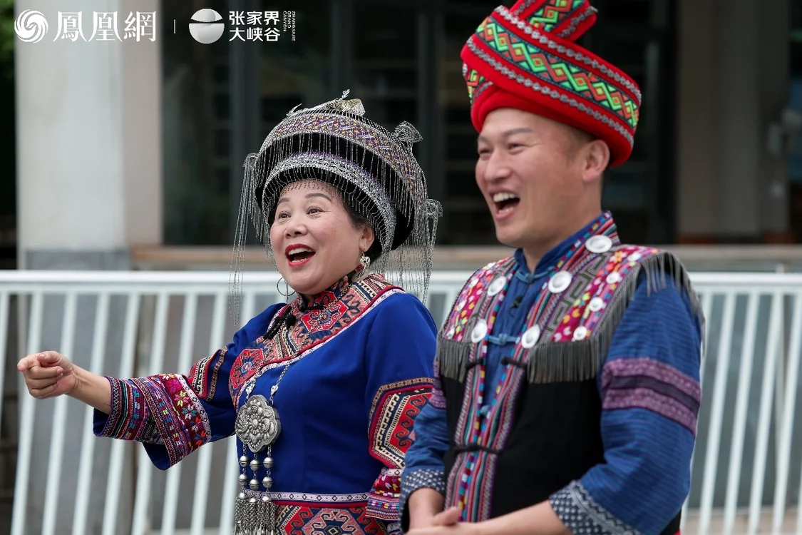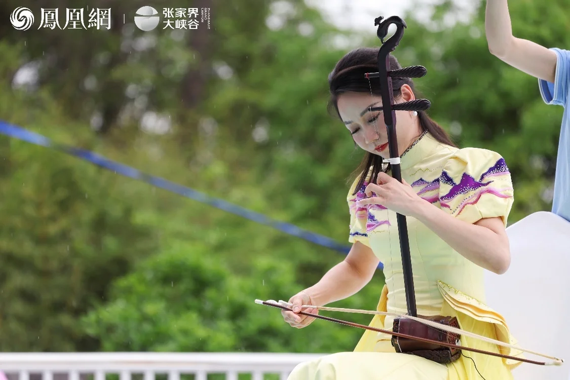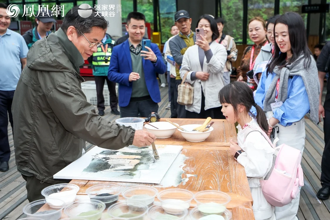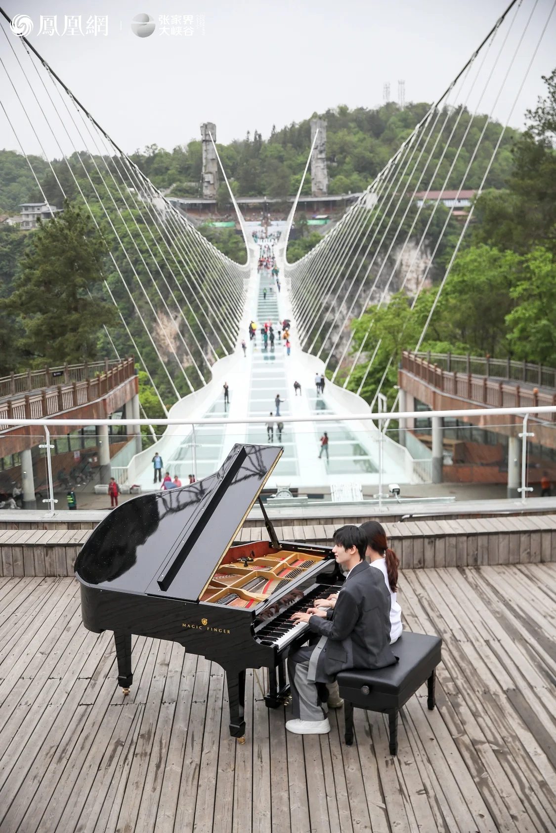 桥的另一头,国家级非遗代表性传承人向佐绒师徒高唱桑植民歌,砂石画创始人李军声现场创作,来自中国魔指精灵的青年钢琴家汤钰晨与小伙伴们四手联弹,张家界大峡谷景区员工合唱AI谱曲的原创歌《峡客吟》。一个个精彩的节目,将现场气氛不断推向高潮,游客们纷纷高举手机抓拍,盛赞情绪价值拉满。