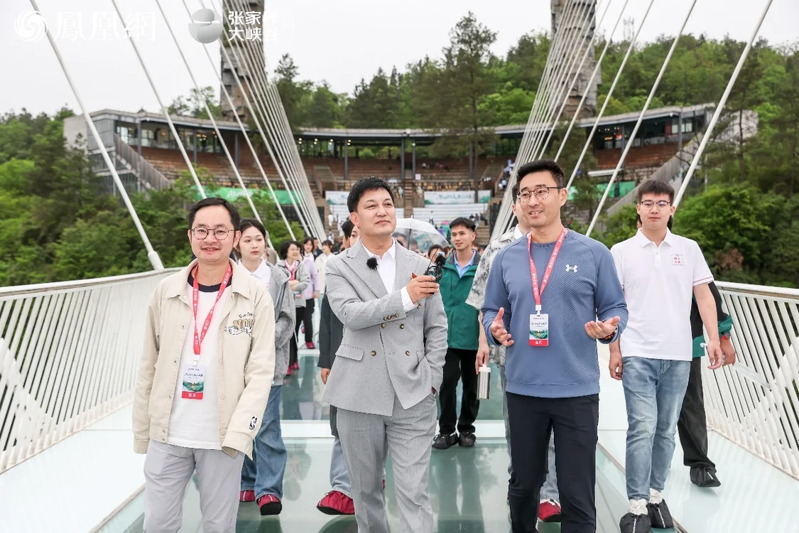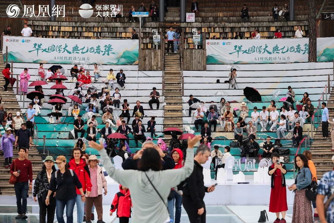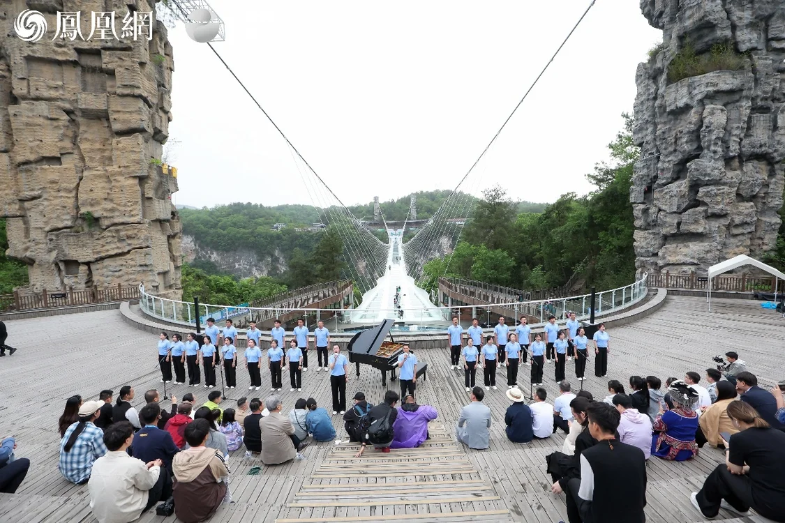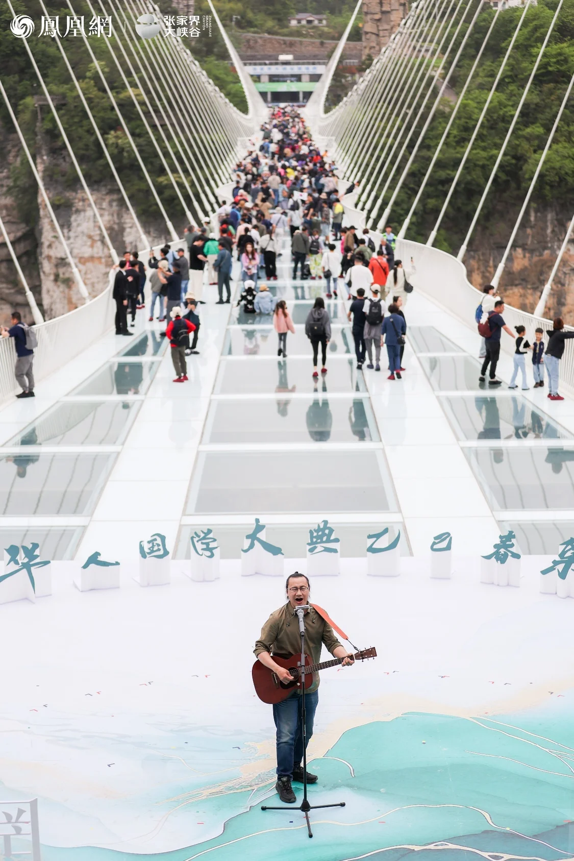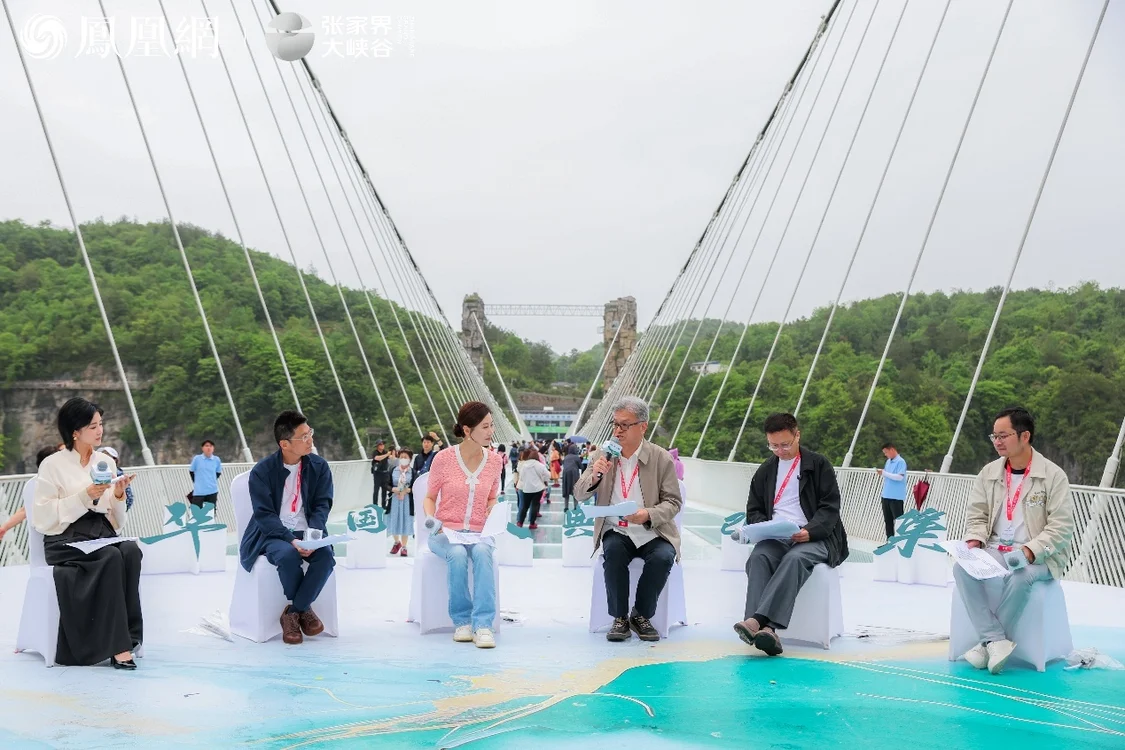 以诗为桥,云天可渡。4月22日下午,由凤凰网和张家界大峡谷联合主办的“华人国学大典乙巳春集:AI时代的诗和远方”盛大启幕。惊艳世界的张家界大峡谷玻璃桥,变身为诗意与科技交融的唯美舞台。孙若风、石厉、陈宇翔、王学松、吴昕孺、余世存、陈涌海、杨雨、罗晴秋、彭敏、罗子杰、李在峰等近百位知名诗人、文化学者、文旅专家,以及艺术、非遗、养生等领域的业界精英和网红达人,共赴悬崖上的春天之约,纵论AI时代的文学新趋势与文旅新范式,并与中外游客漫步于云端之上,演绎了一场自然山水与人文科技交织的诗歌嘉年华。