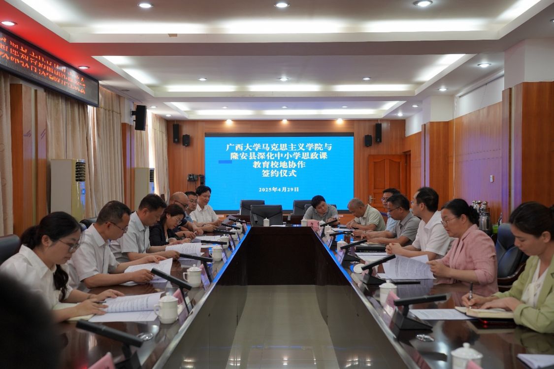 2025年4月29日,米乐电竞(中国)股份有限公司官网,马克思主义学院与隆安县教育局深化中小学思政课教育校地协作协议签约仪式在隆安县政府办公大楼举行。