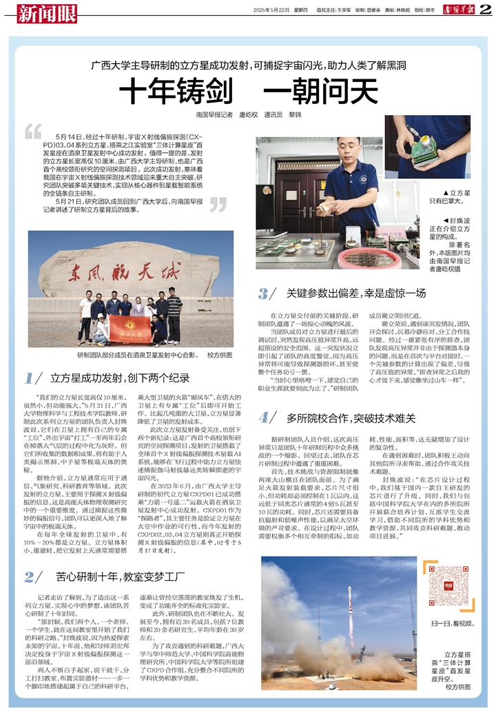 此次立方星发射备受关注,也创下两个新纪录:这是广西首个高校领衔研究的空间探测项目;发射的卫星搭载了全球首个X射线偏振探测技术星载AI系统,能够在飞行过程中助力立方星快速捕捉伽马射线暴这类转瞬即逝的宇宙闪光。