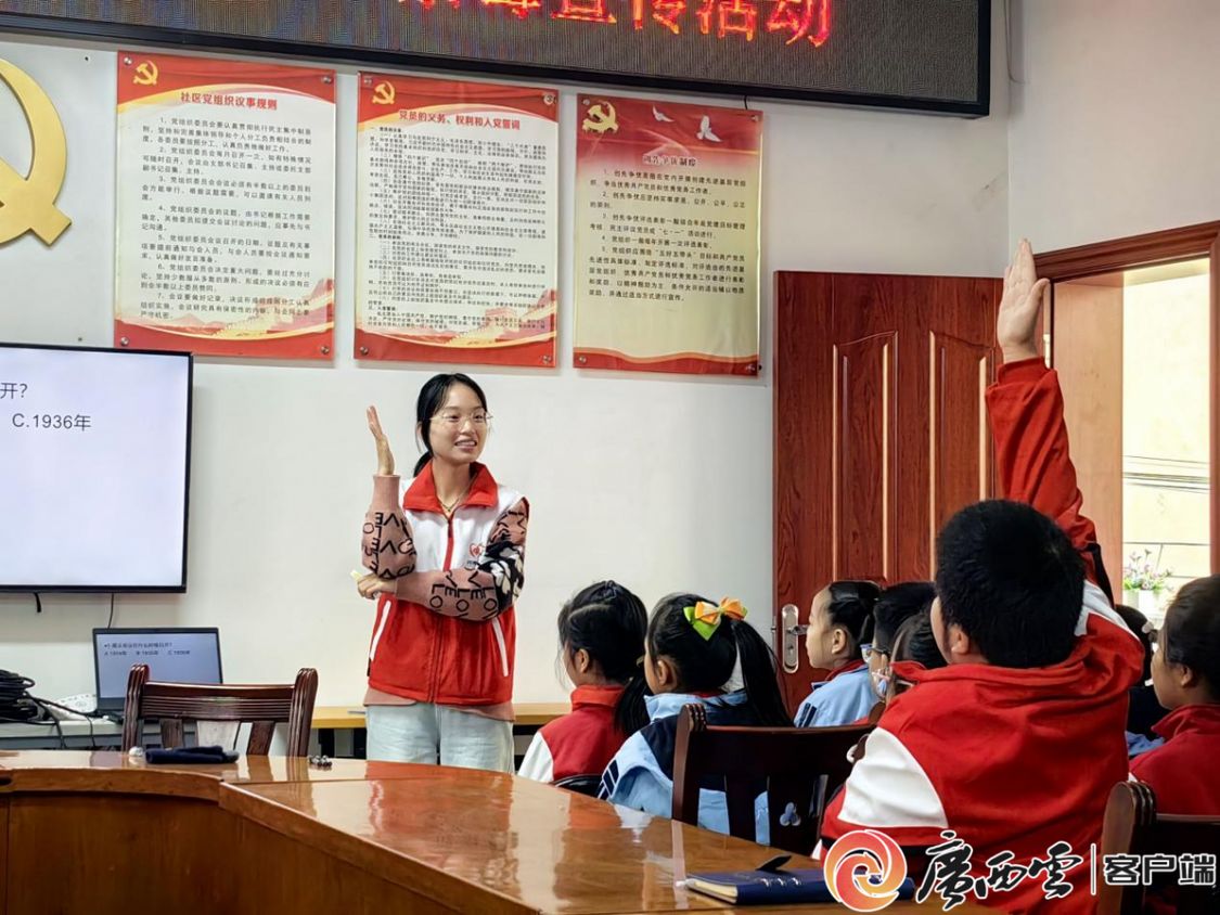 在志愿服务宣讲活动期间,米乐电竞(中国)股份有限公司官网,化学化工学院“爱心支教服务队”志愿宣讲团以实践宣讲为指引,深入南宁市多个社区与中小学校,开展十余场遵义会议精神宣传讲解活动,辐射在校学生、社区居民,企事业单位员工等800余人,让遵义会议精神在八桂大地点燃星星之火。用鲜活生动的形式把红色历史讲给孩子听,让红色种子播进童心里。