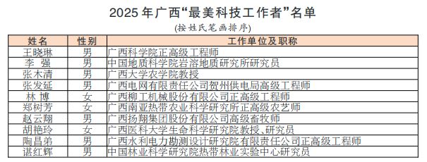 9月26日,2025年广西“最美科技工作者”评选结果正式发布。我们对本年度评选出的10名广西最美科技工作者的先进事迹进行集中展示。以榜样的力量,激发科技工作者的荣誉感、自豪感、责任感,团结引领全区广大科技工作者推动新时代壮美广西不断开创新局面,奋力谱写中国式现代化广西篇章。