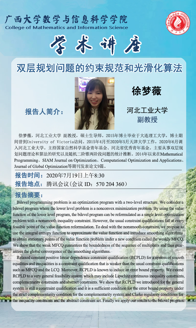 数信学院学术报告:双层规划问题的约束规范和光滑化算法
