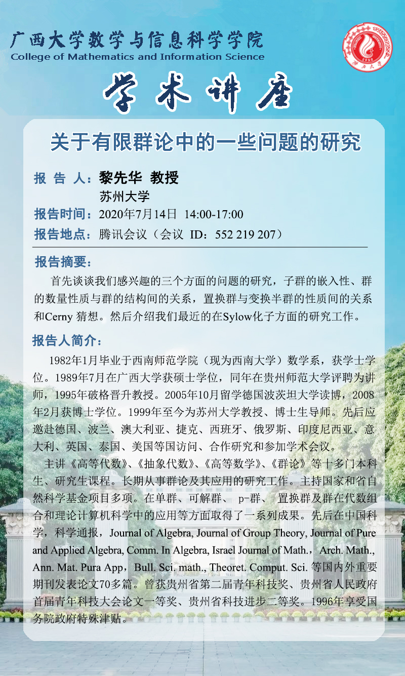 主讲人 黎先华 教授 苏州大学 地址 腾讯会议 会议ID:552 219 207
